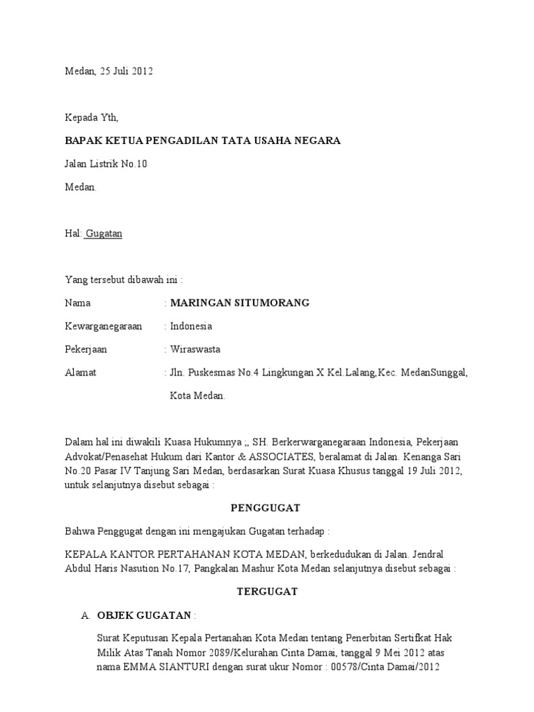 Surat kuasa adalah surat yang isinya mengenai pemberian wewenang atau kuasa dari seseorang atau satu pihak kepada orang lain atau pihak lain untuk melakukan suatu hal seperti yang tertera dalam isi surat. Surat kuasa ini harus ditulis dengan bahasa yang jelas, singkat dan mudah dipahami sehingga orang yang menerima kuasa mengerti maksudnya. Please fill this form, we will try to respond as soon as possible. Doc contoh surat gugatan perkara ptun wahyu liwang. We are a sharing community.