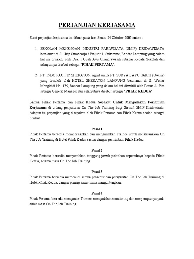 Contoh surat perjanjian kerjasama bagi hasil contoh surat. Ketika dua orang atau 2 instansi melakukan kesepakatan, biasanya akan diperlukan sebuah perjanjian atau jaminan untuk kepastian. Surat kerjasama antara sebuah perusahaan dengan pekerjanya harus dibuat agar dalam kelangsungan kegiatan, tidak ada pihak yang merasa dirugikan. Contoh surat perjanjian kerjasama paling sederhana. Dalam surat ini bertindak atas nama hotel utama raya international dan selanjutnya disebut.